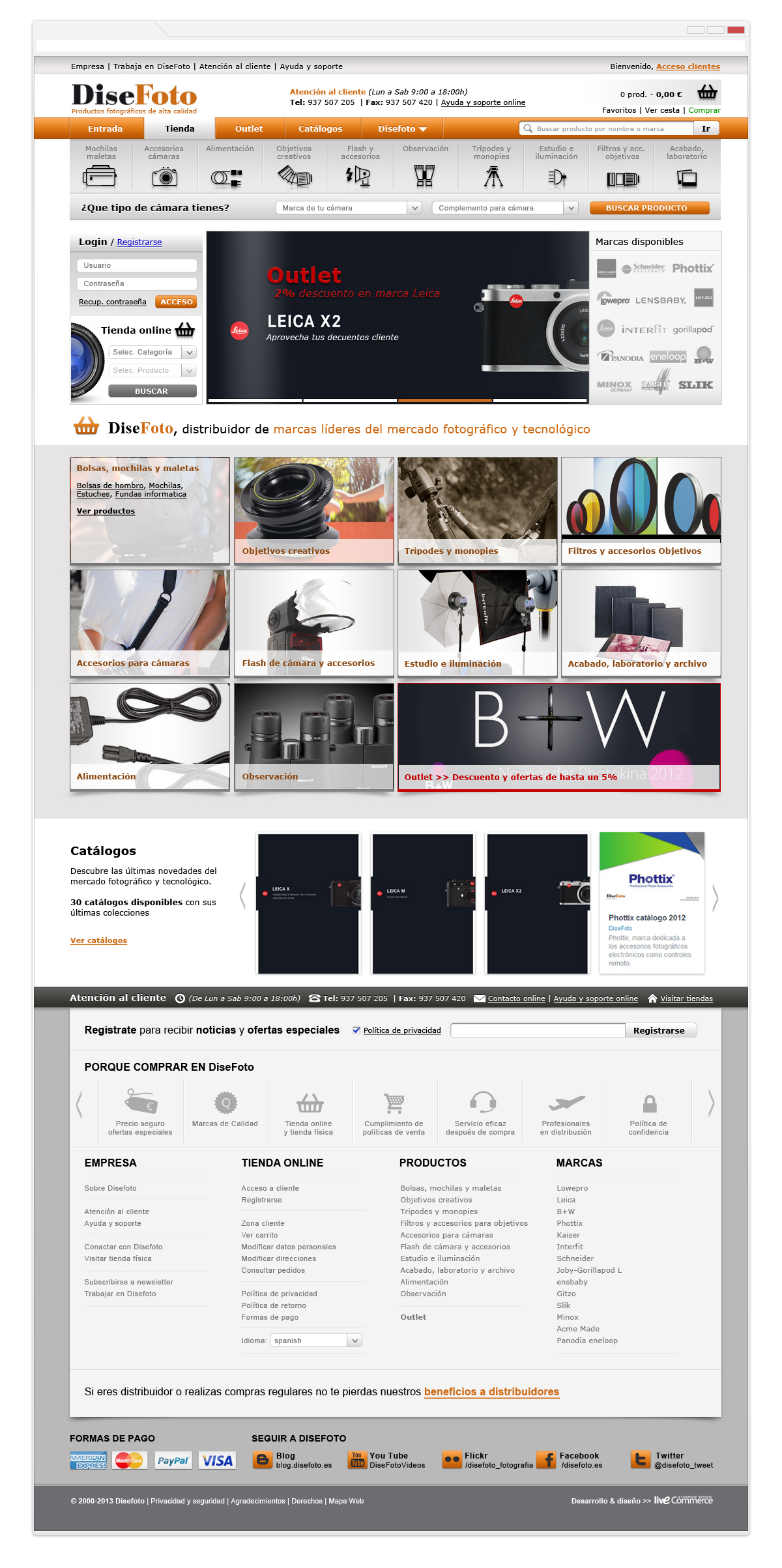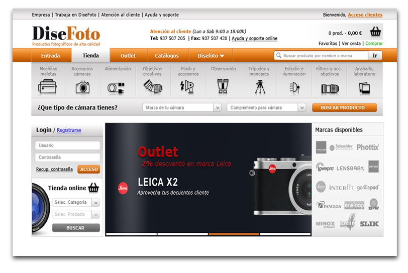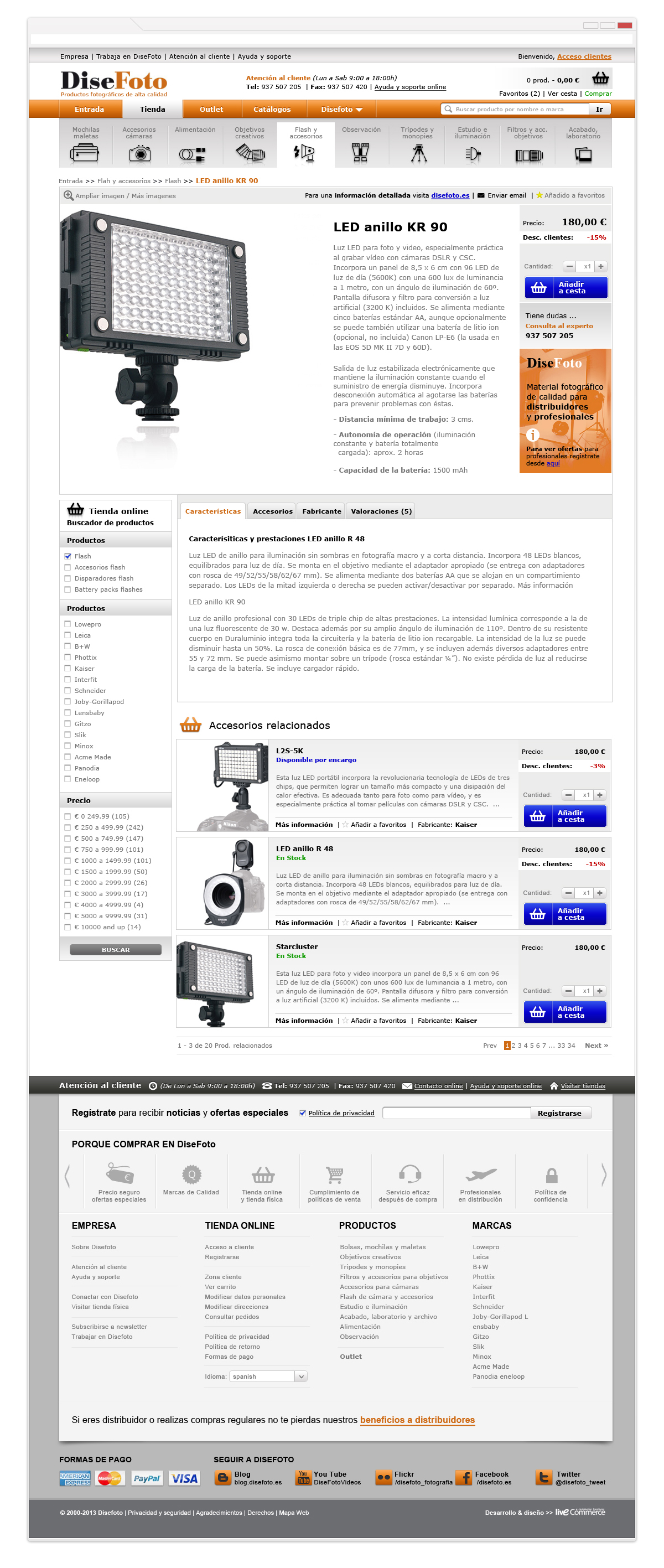 Disefoto es una importante empresa de venta de productos de fotografía para profesionales del sector. La imagen corporativa propuesta para ellos incluya diferentes iconos para ayudar a los usuarios en la navegación por sus diferentes categorías de productos. La imagen requerida debía ser puramente de tienda online B2B con diferentes zonas atractivas que sirvieran también de muestrario de catálogos.