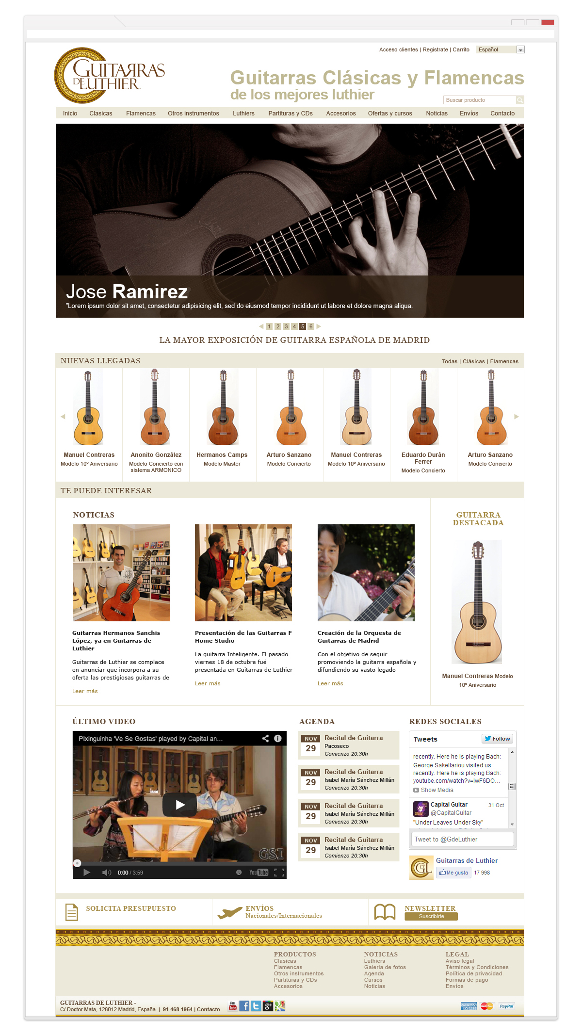 Guitarras de Luthier dispone de una tienda en el centro de Madrid. Antes de iniciar el proyecto ya disponían de experiencia online con una web corporativa realizada por ellos mismo. Este hecho facilito la realización del diseño del proyecto, gracias a la implicación del cliente en el proyecto. Una parte fundamental del proyecto era aportar a los usuarios material interactivo no sólo para mejorar las ventas sino para crear un espacio de entretenimiento y formación, donde se destacara la parte más social. Para ello se realizó una página de inicio sencilla donde se destacaba la información más importante de eventos, noticias, redes sociales, incluso los últimos vídeos de muestra del sonido de las guitarras. El resultado es una tienda online minimalista, con toda la información esencial para entrar en el fascinante mundo de los acordes.