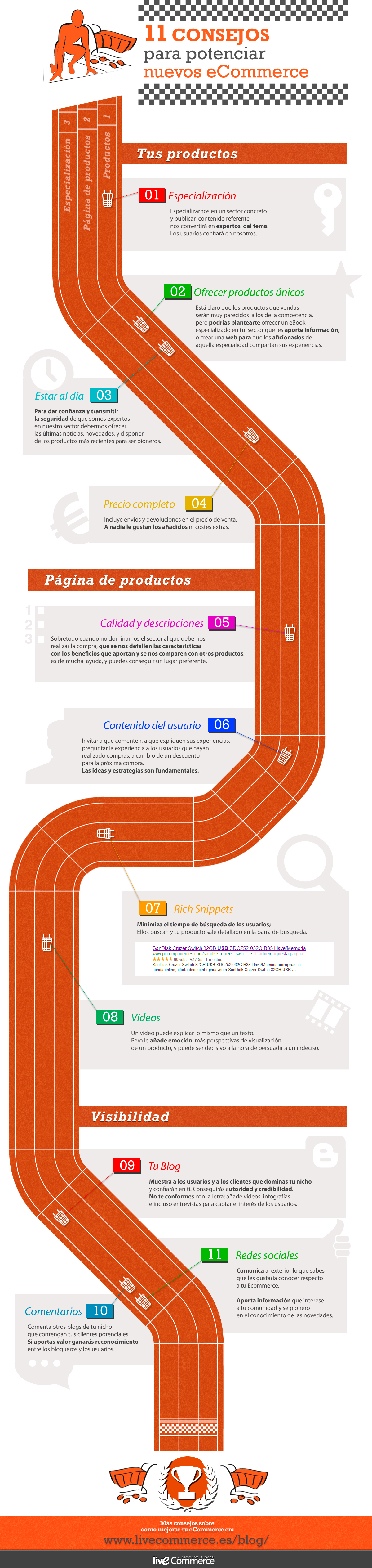 Diseño de infografía para liveCommerce, empresa especializada en eCommerce B2B (business to business) y B2C (business to customers), explicando las 11 consejos diferentes sobre como potenciar el éxito de las tiendas online. Infografía ilustrada pensada para estar publicada en el blog interno de la propia empresa y en diferentes blogs del sector.