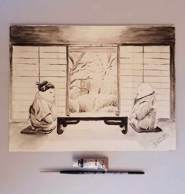 Ilustración en acuarela inspirada en la ceremonia del té china Cha-no-yu.