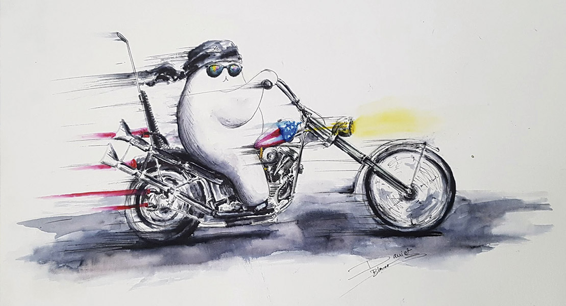 Ilustración de Mister Bubble Boy  sobre Harley Davidson en acuarela y pilot.