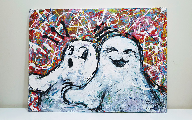 Pintura basada en la vida y lenguaje de la discoteca representado mediante personaje ilustrado Bubble Boy. Cuadro en acrílico sobre soporte de tela de marco fino de 70x40cm. y pilot en homenaje al carnaval 2020
