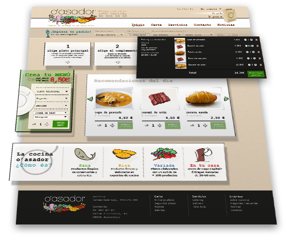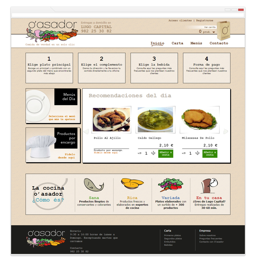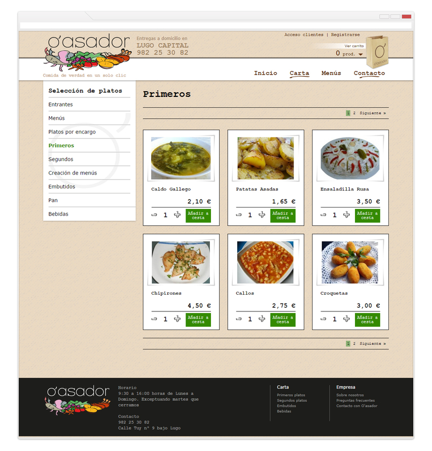 Oasador es un restaurante de Lugo, que quería aumentar su negocio a través de internet. La tienda creada era una plataforma para que sus clientes puedan reservar platos y menús predefinidos y llevarlos a casa en la propia ciudad.
