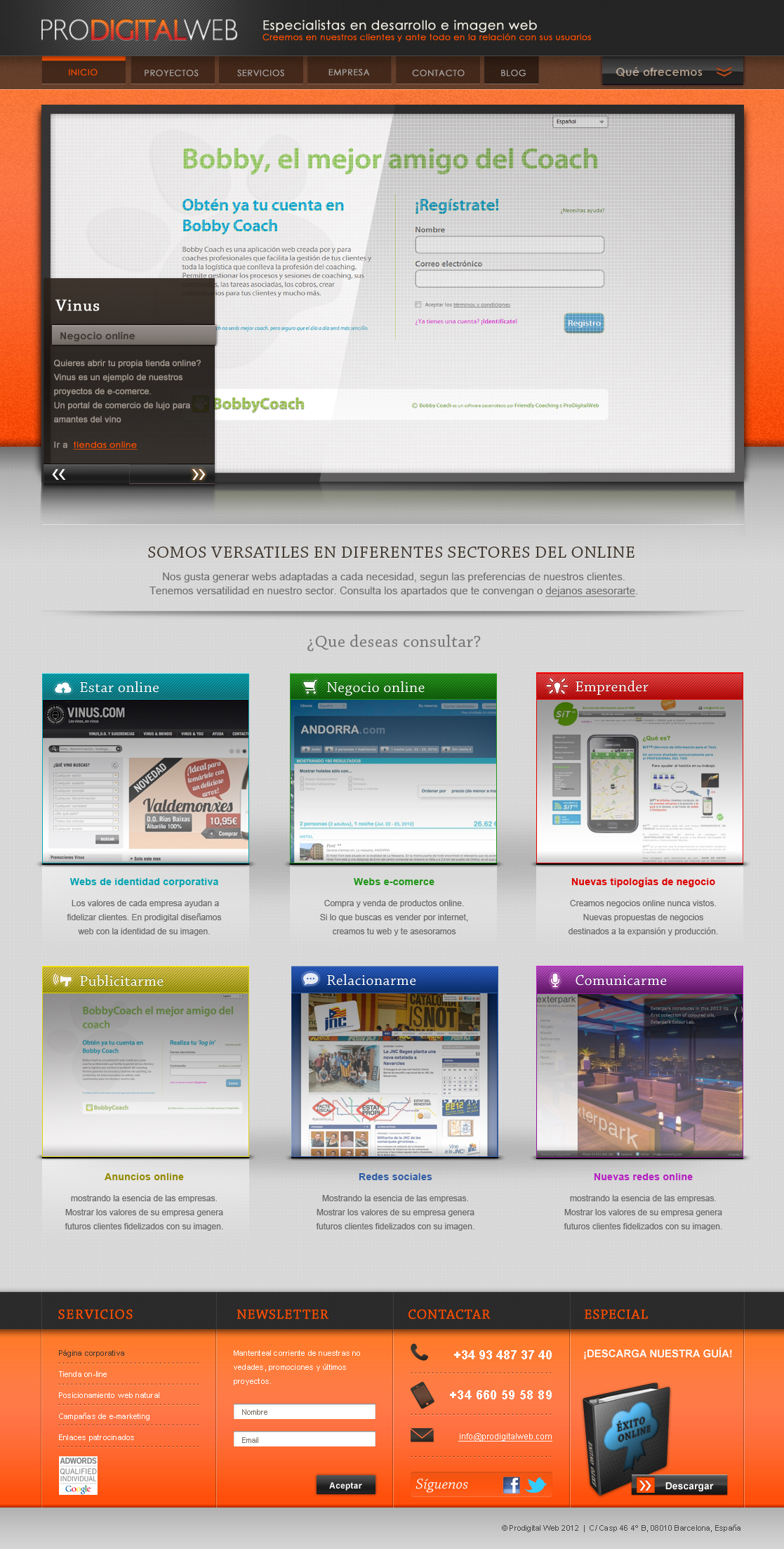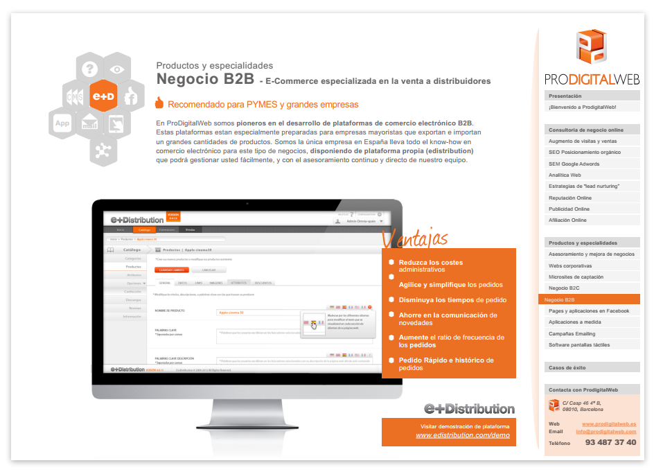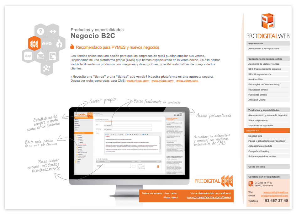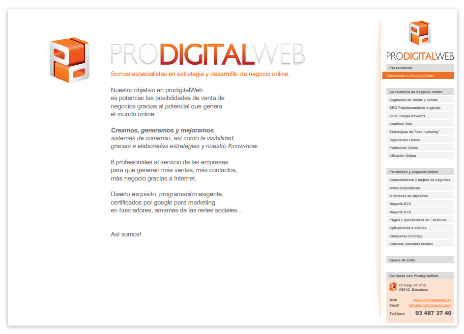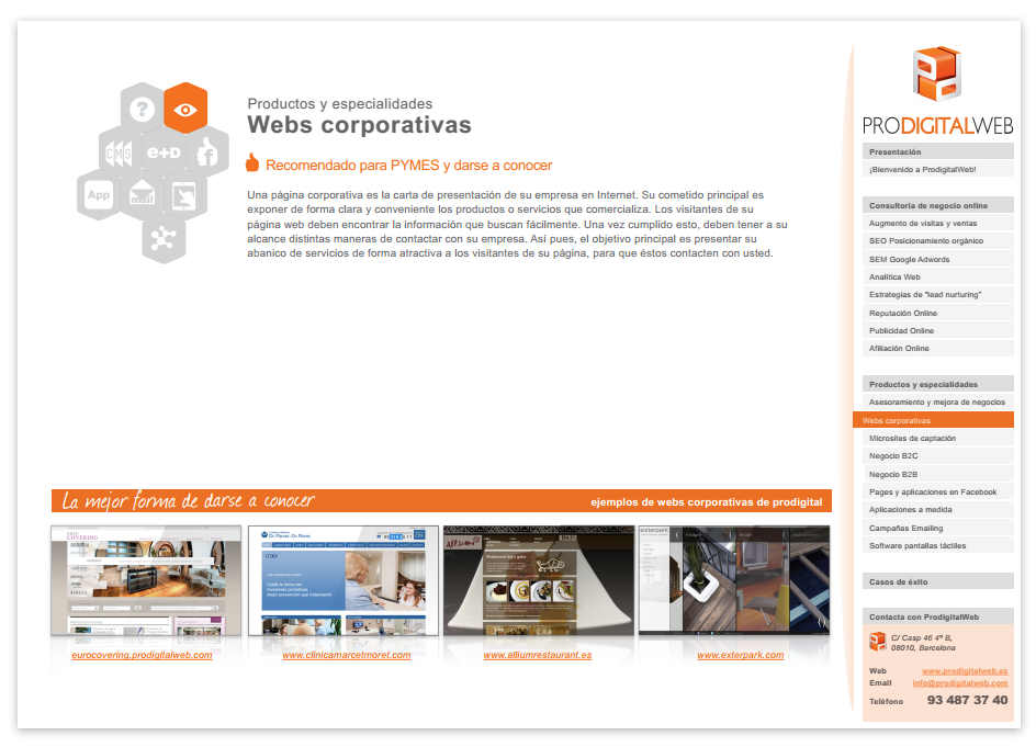 ProdigitalWeb es una empresa de diseño de páginas web corporativas y marketing online. En ella cree propuestas para diferentes catalogos y papelerías corporativas promocionales y web. Los catálogos y página web mostrada a continuación son un pequeño ejemplo del material preparado.