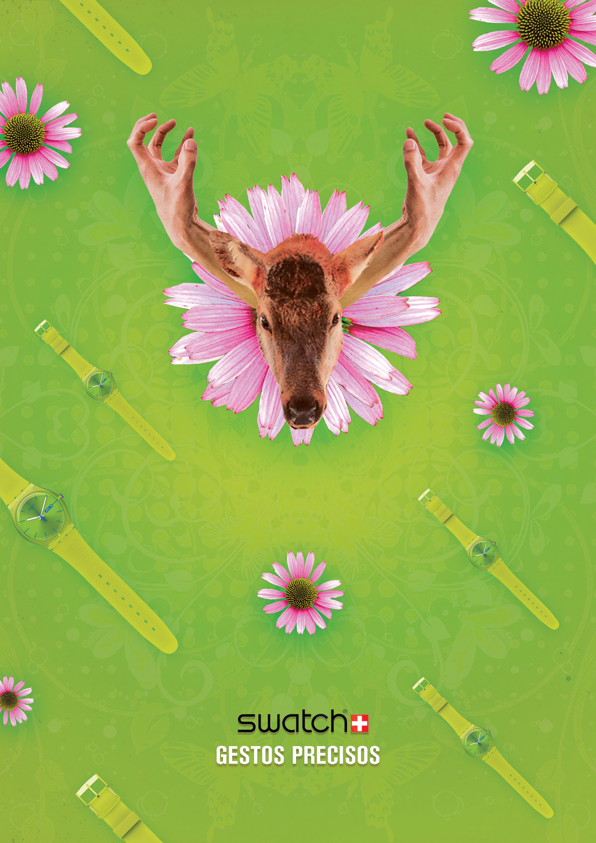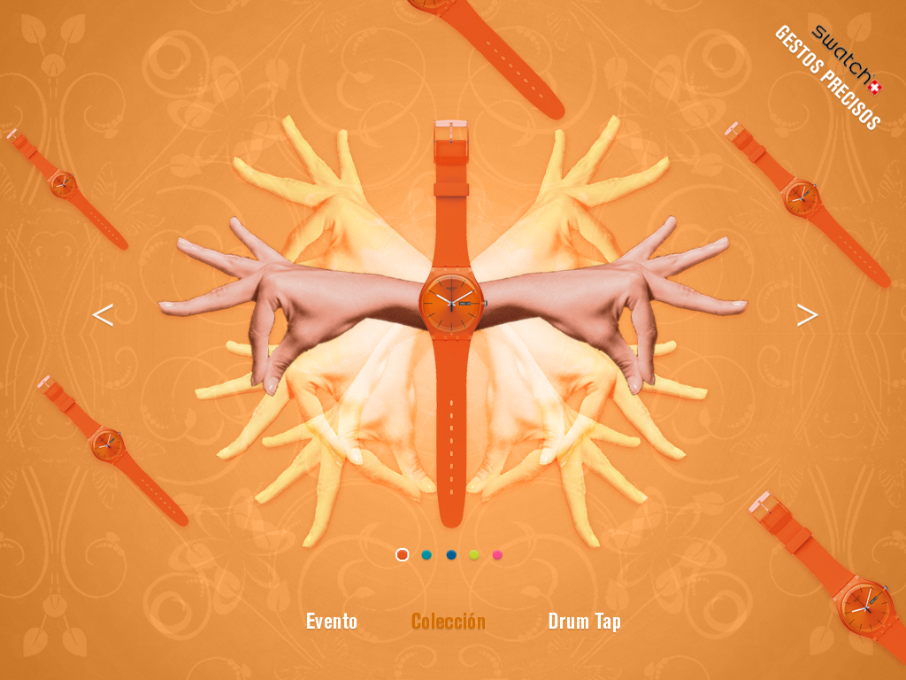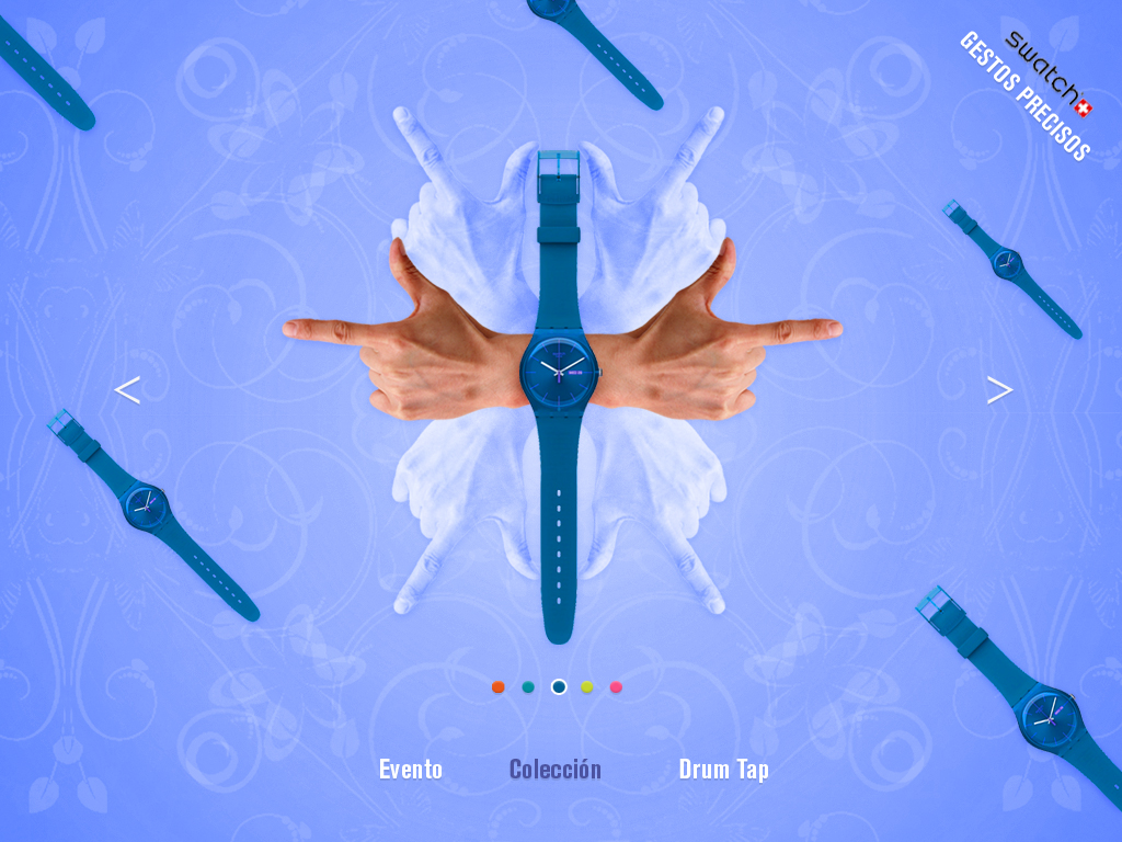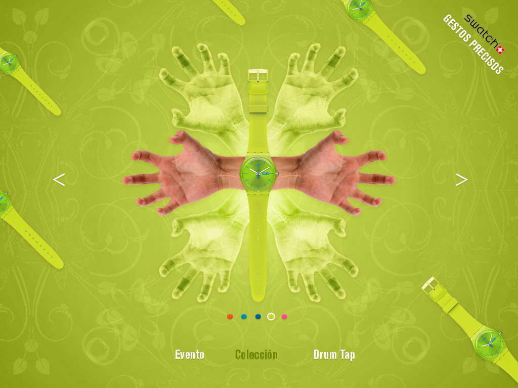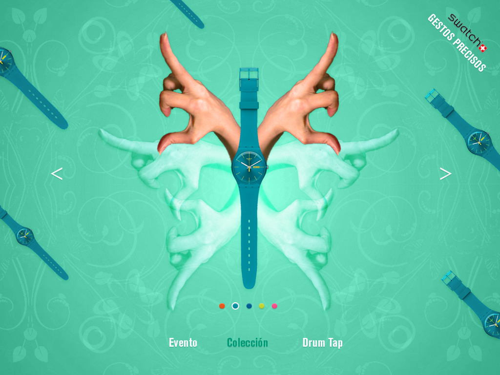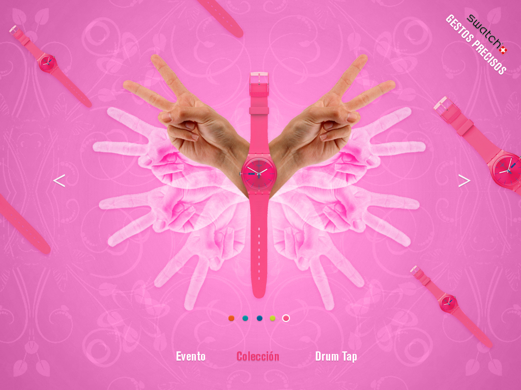Propuesta de gráficas y website para swatch en época de estudiante. El proyecto bajo el copy «gestos precisos» recopilaba diferentes keys visuales con posturas de manos que inspiran emociones.  Los carteles de campaña incluían un juego visual entre las manos e imágenes complementarias para transmitir la esencia, mientra que la web sirve de muestrario de la colección gracias a vivas composiciones realizadas a partir de las fotografías realizadas de diferentes planos de manos.